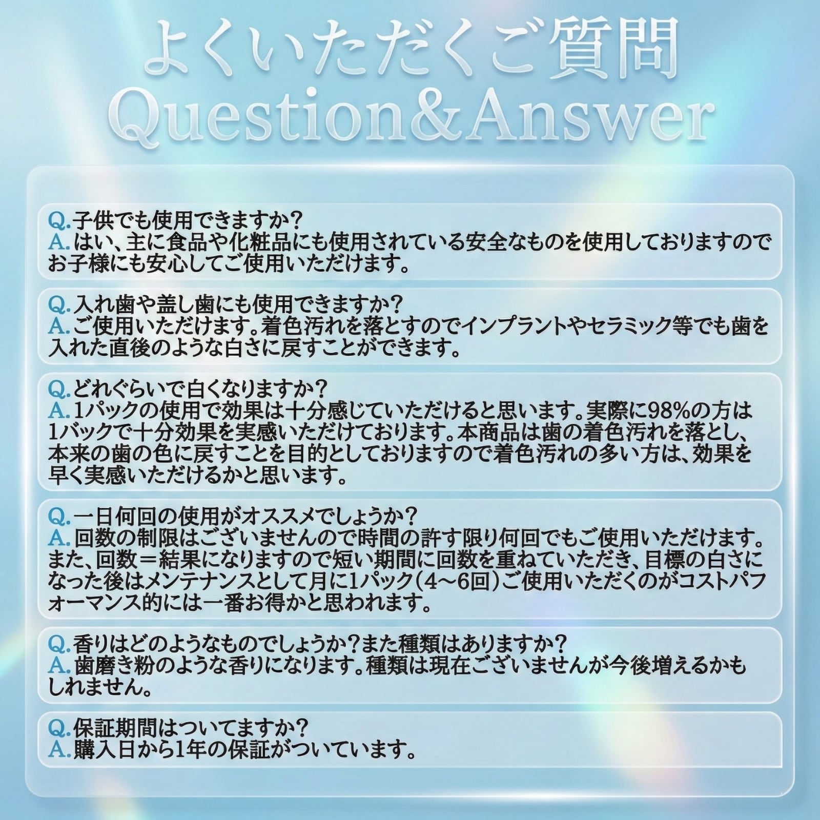 「ホワイトニングはしみる・痛い」というイメージを払拭。食品や化粧品にも使われる安全な成分を使用しているため、歯や歯茎へのダメージを最小限に抑え、痛みを感じにくい処方です。
