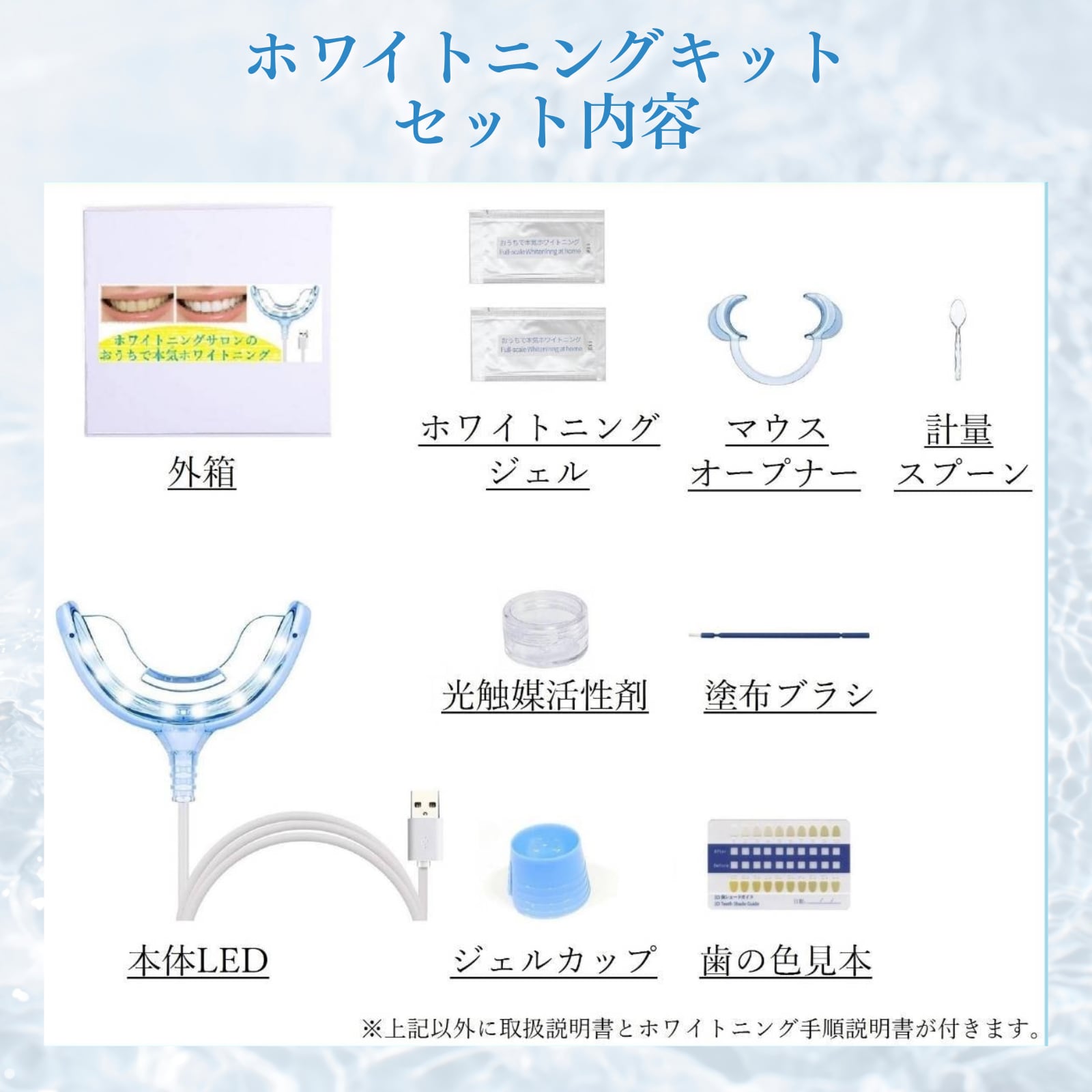 キーワード: ホワイトニングキット, セルフホワイトニング, 歯を白くする, 自宅, ホームホワイトニング, LEDライト, 酸化タングステン, ステイン除去, ヤニ取り, 美白